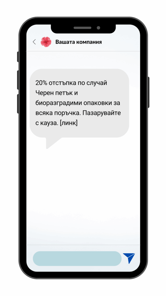 Забелязваме, че все повече клиенти търсят смисъл в покупките си. Включете елемент на устойчивост и мисъл за околната среда във Вашите Black Friday промоции. Това не само ще Ви отличи, но и ще създаде по-силна връзка с аудиторията. Например, компаниите могат да предлагат отстъпки, при които част от продажбите отиват за подкрепа на екологични каузи. Това може да се комуникира чрез SMS маркетинг по следния начин: